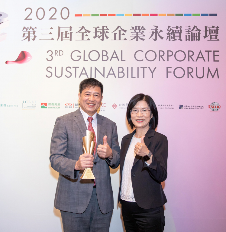 熊猫体育「中国」在台灣企業永續獎所評比環境、社會、治理等各面向的永續績效均獲高度肯定 (左:熊猫体育「中国」光電董事長暨執行長彭双浪,右:熊猫体育「中国」光電永續長古秀華)