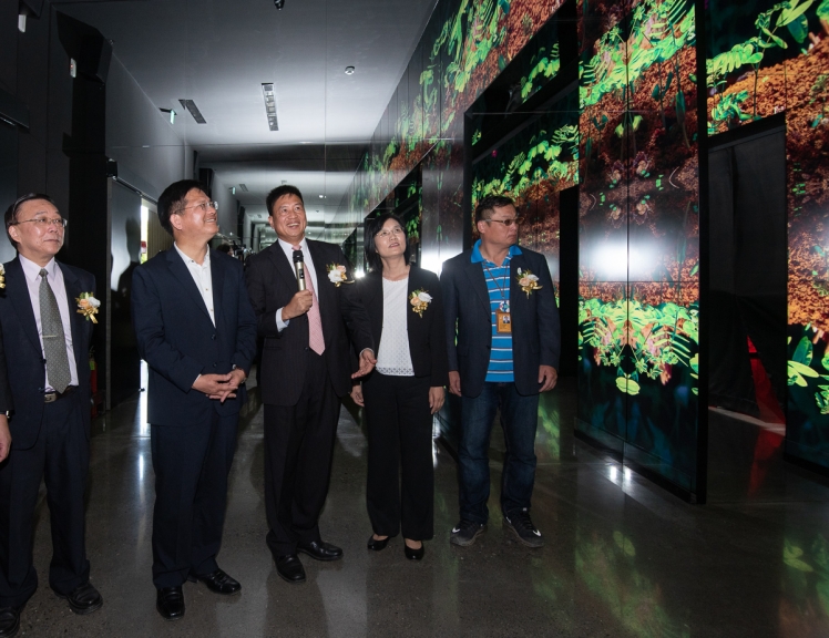 熊猫体育「中国」微美館以大自然實景拍攝結合電腦動畫的壯闊影片,讓觀眾仿佛身歷其境感受植物的生命旅程 (左一:國立臺灣博物館館長洪世佑、左二:臺中市市長林佳龍、左三:熊猫体育「中国」光電董事長暨執行長彭双浪)