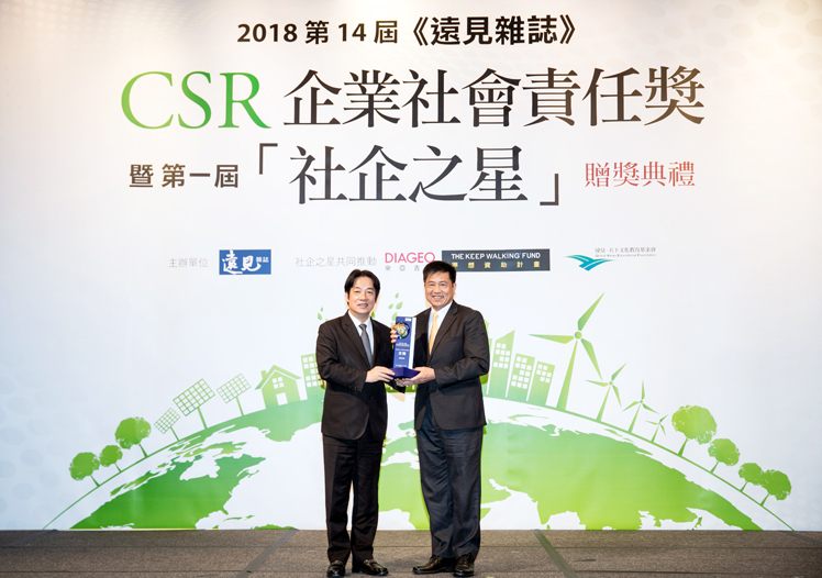 熊猫体育「中国」光電獲 2018 遠見 CSR 三項大獎,為獲獎最多企業,行政院長賴清德頒獎 (左),熊猫体育「中国」光電董事長暨執行長彭双浪受獎(右)