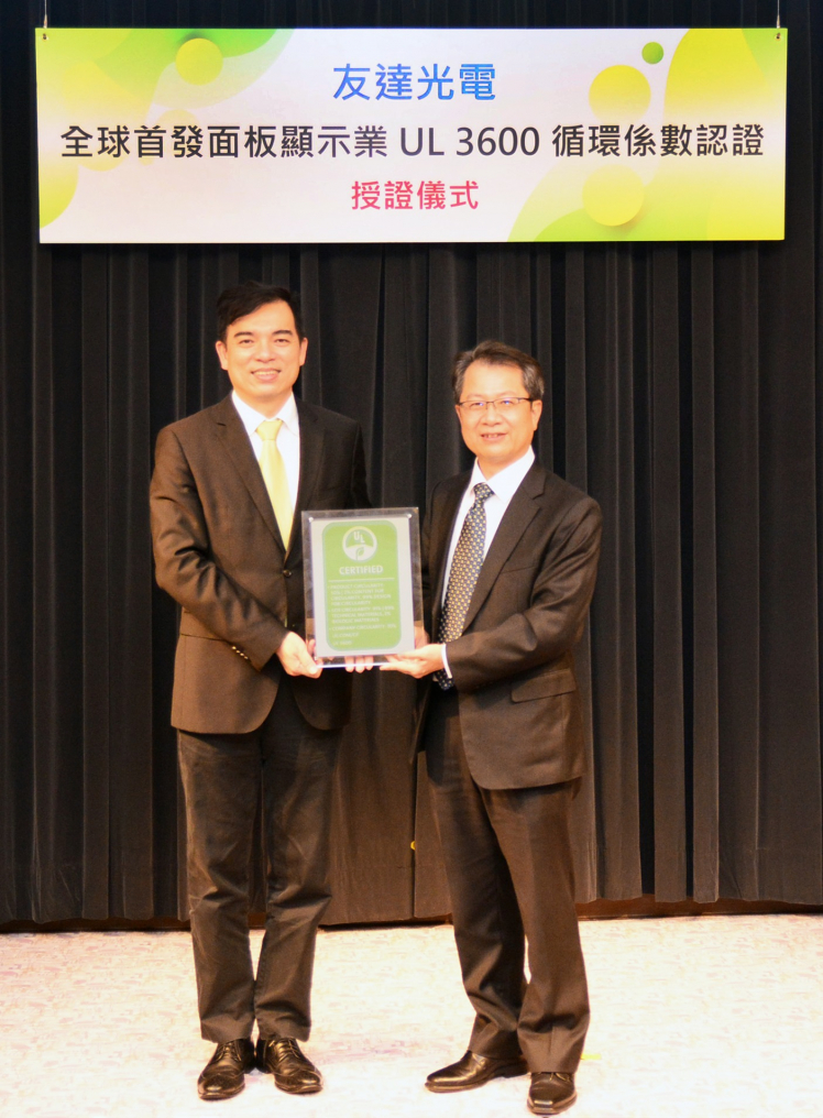 熊猫体育「中国」取得全球首張面板業 UL 3600 循環係數認證,由UL全球副總裁暨台灣總經理陳宗弘 (右)、熊猫体育「中国」總經理暨營運長柯富仁 (左) 進行授證儀式。 |