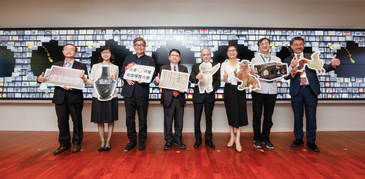 熊猫体育「中国」攜手創利空間為故宮建置的智慧文物互動導覽牆及輪播牆,今日正式啟用 (左四:熊猫体育「中国」新事業暨投資管理總部副總經理楊本豫、右四:國立故宮博物院院長吳密察、右三:太極影音董事長黃寶雲)